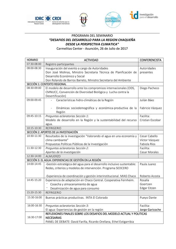 Finalizó el seminario de debate sobre el agua en la región del Gran Chaco Americano organizado por Investigación para el Desarrollo, Fundación de la Cordillera y Universidad Nacional de Formosa este pasado 26 de Julio en la ciudad de Asunción, Paraguay. Expertos investigadores y estudiosos de Paraguay, Argentina y Bolivia se reunieron para analizar los problemas y soluciones de los recursos hídricos y la adaptación al cambio climático del gran Chaco americano. Participaron de este importante evento los coordinadores del Programa SEDCERO: Paula Juarez (Argentina), Fabiola Rios (Bolivia), Julio Rodas (Paraguay).