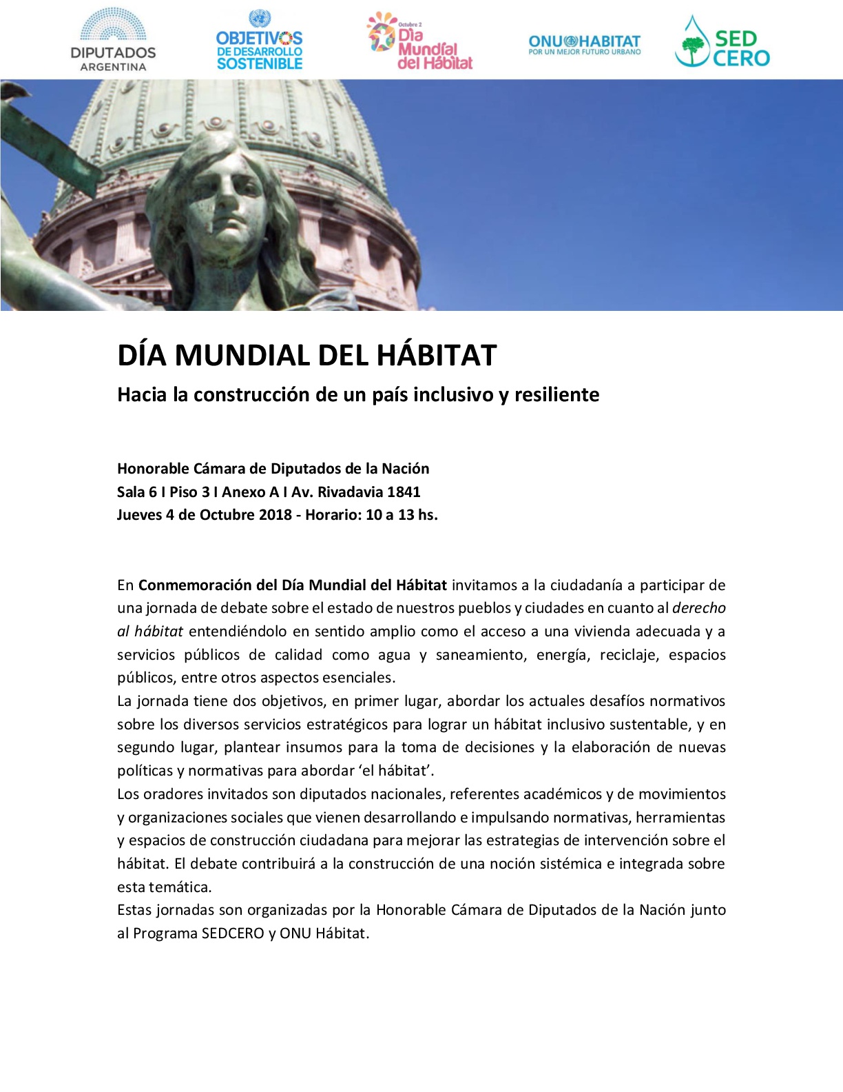 Estas jornadas son organizadas por la Comisión de Recursos Naturales y Conservación del Ambiente Humano de la Honorable Cámara de Diputados de la Nación junto al Programa SEDCERO y ONU Hábitat.
